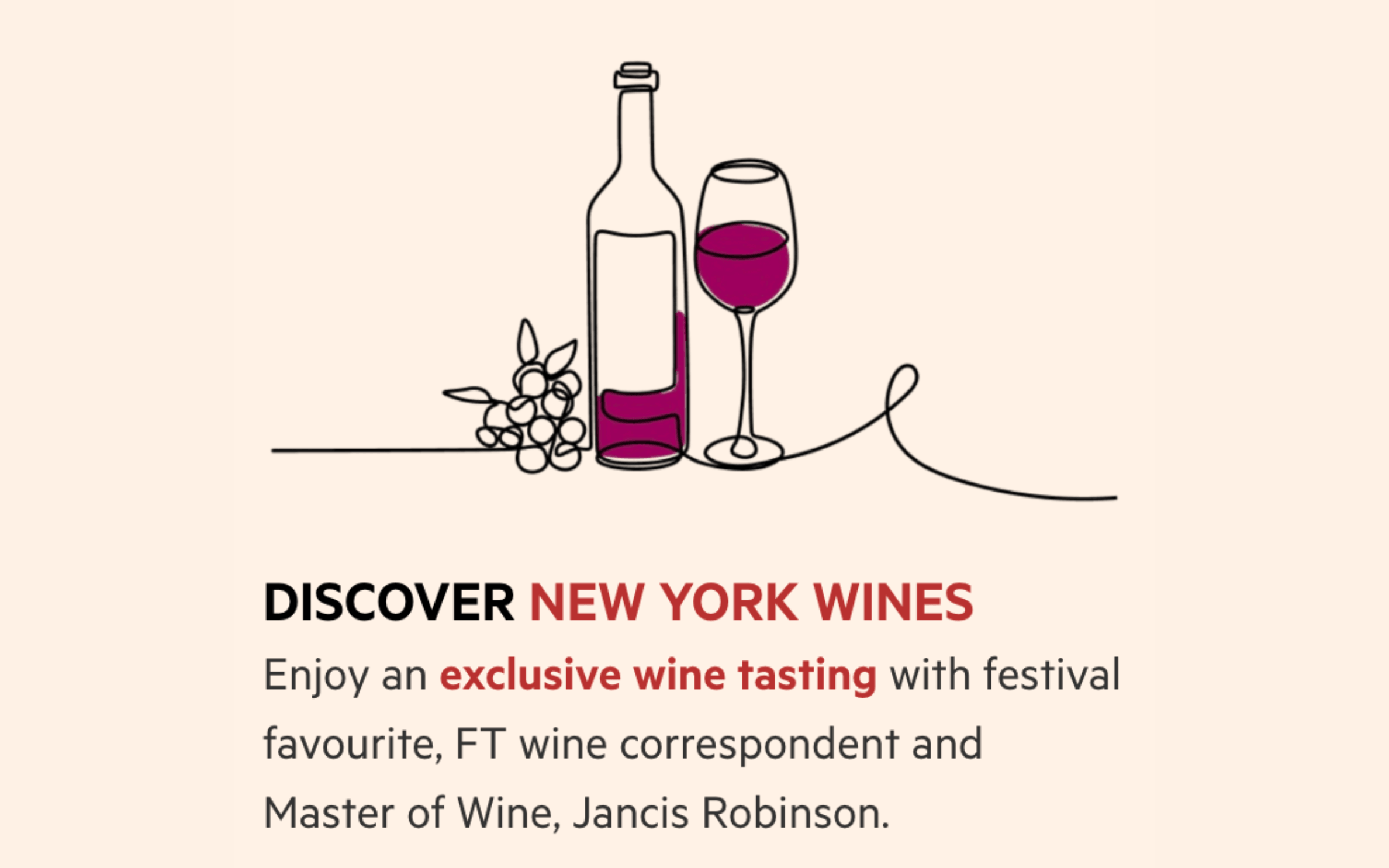Join us at Spring Studios Tribeca, the home of this year's Financial Times Weekend Festival. Ongoing programming features “Tasting New York Wines - A Tour From Long Island to the Finger Lakes,” which will be hosted by Jancis Robinson, FT's wine columnist and Master of Wine, with Tara Thomas, managing editor, JancisRobinson.com.